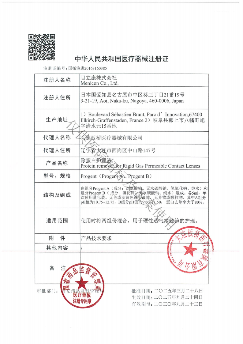 | 医疗器械名称 | 除蛋白护理液 Protein remover for Rigid Gas Permeable Contact Lenses |