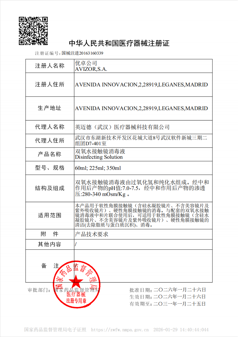 | 适用范围1 | 双氧水接触镜消毒液:适用于软性隐形眼镜(含硅水凝胶、不含美容镜片及紫外线吸收镜片)、硬性角膜接触镜的消毒。配套的双氧水接触镜消毒液中和片联合使用,可适用于软性角膜接触镜(含硅水凝胶镜片,不含美容镜片和紫外线吸收镜片)、硬性角膜接触镜的清洁(去除脂质与蛋白沉积)、消毒。 |