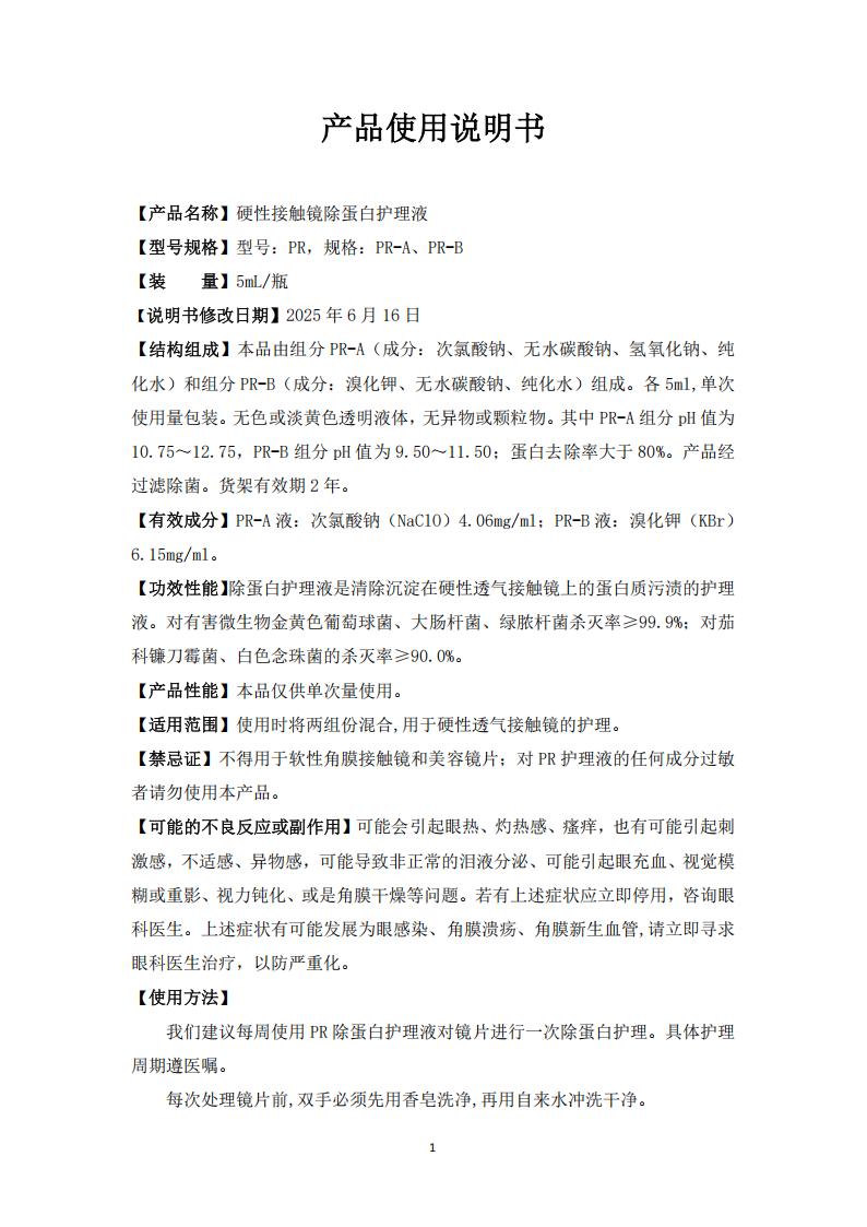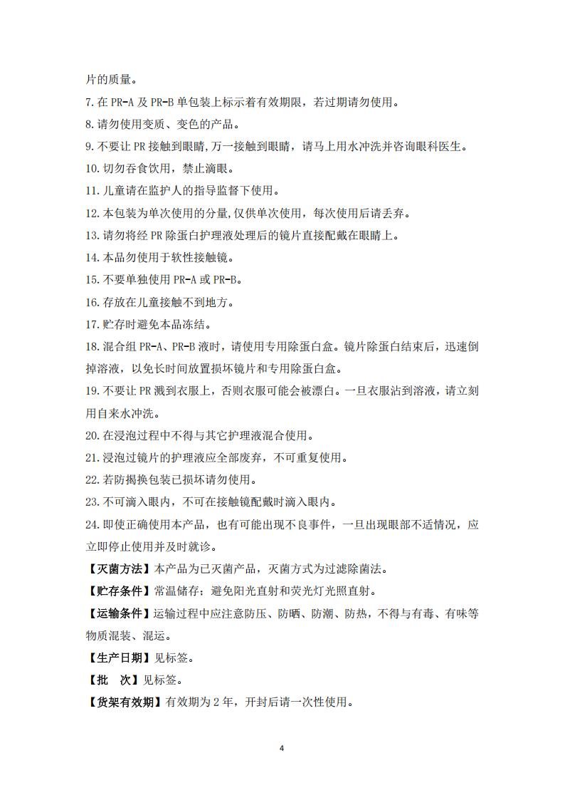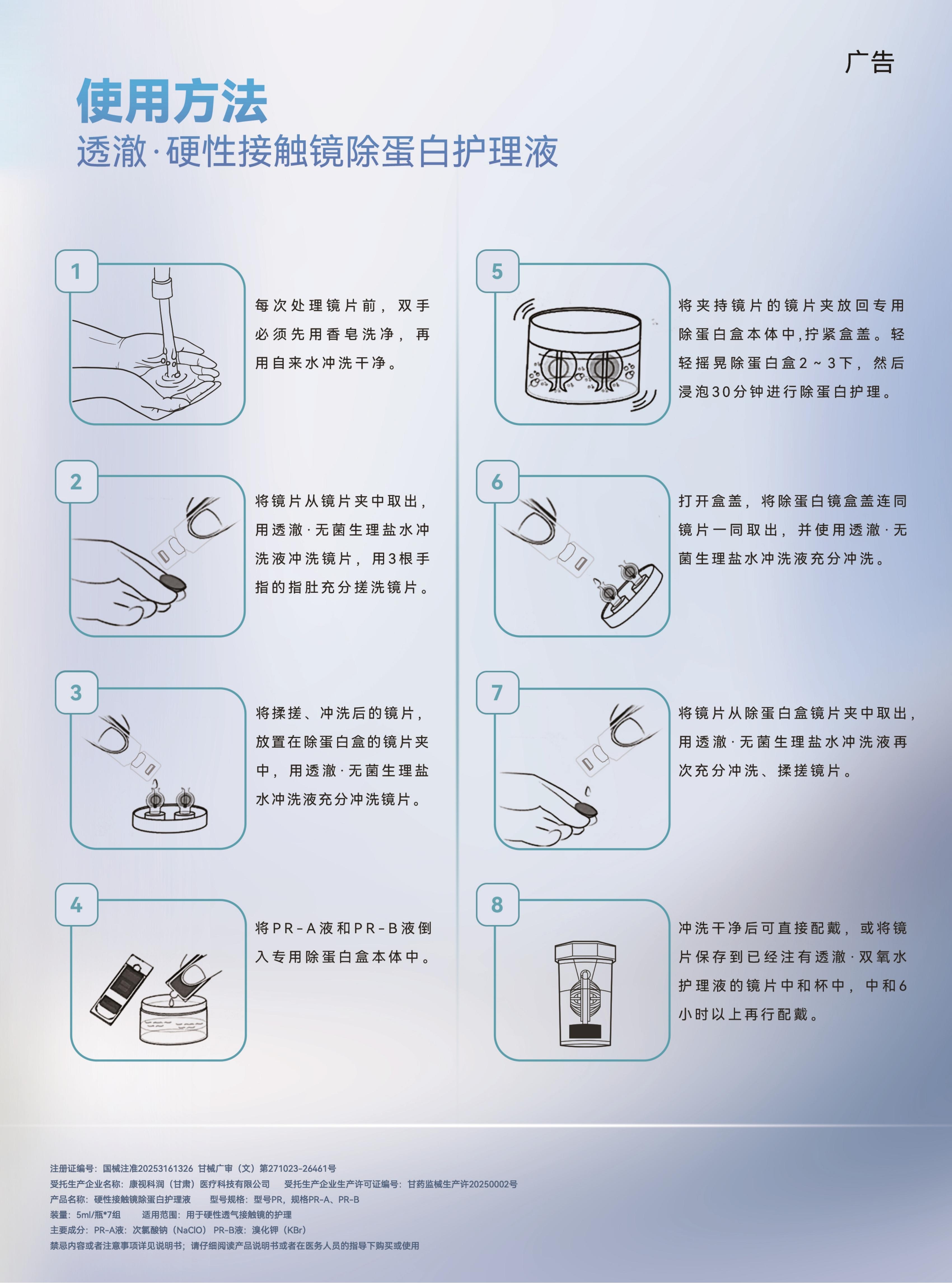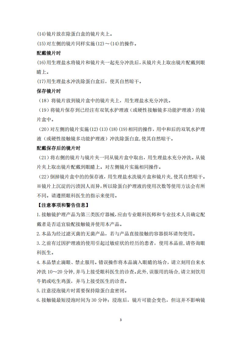 | 禁忌症 | 除蛋白护理液产品,请勿直接入眼。不得用于软性接触镜或美容片。对本产品任一成分过敏者,请勿使用。 |