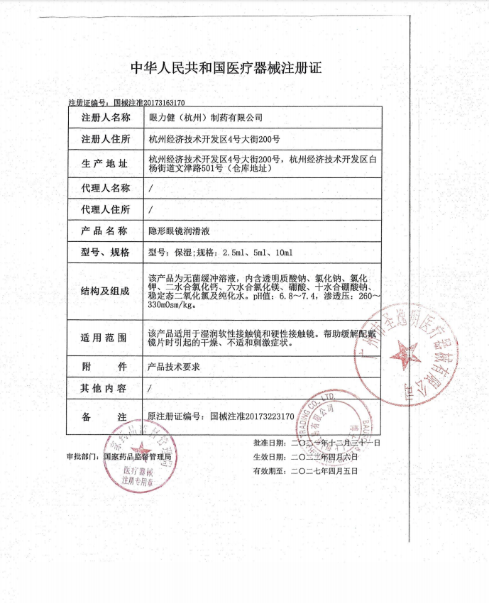 | 医疗器械名称 | 隐形眼镜润滑液 |